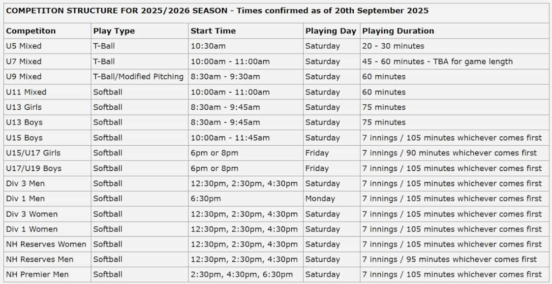 UPDATES: FEE OPTIONS We have multiple payment options or contact Suzette (treasurer@ecbsoftball.org.nz) to set up a payment plan. Please note: all fees must be paid in full by the first Saturday of play (unless a payment plan is arranged). ECB WEBSITE TIPS - www.ecbsoftball.org.nz Our ECB Softball website is your one-stop hub for everything you need — from the weekly draw and merchandise shop to the calendar, latest updates, past emails, rules, and more. See below the updated game times, now on the website. Note Div 1 Men is still TBC.  |
